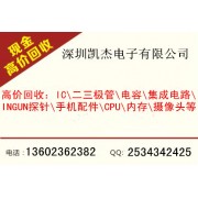 深圳市凯杰电子有限公司,高价求购:库存IC,二三级管,电容,晶振,DVD,光头,MP3,k9系列,电脑配件,BGA,CPU,手机IC,振动,咪头等等电子料。回收K9F系列FLASH、南北桥、手机IC、电脑周边IC、电视机IC、ATMEL/PIC系列单片机、OV系列摄像头IC、SPHE系列、SAA系列、XC系列、RT系列、TDA系列、CS系列、ATJ2091主控... 被动元件:IRF系列、2SC/2SA、STP系列二三极管、LM2575、BAT54、1N4148、电解电容、钽电容、瓷片电容、贴片电容、贴片电阻、电感。手机配件(苹果,三星,诺基亚,LG,摩托罗拉,多普达,黑霉,国产机)内存卡、手机主板、原装外壳、原装排线、天线、线路板、字库、蓝牙、FLASH、CPU、中频、电源、按键板、电池、充电器、功放、显示屏、送话器、马达、振子、听筒、模块板、摄像头、液晶显示屏、手机镜面及手机各种内外小配件等。 [详细介绍] 联系方式