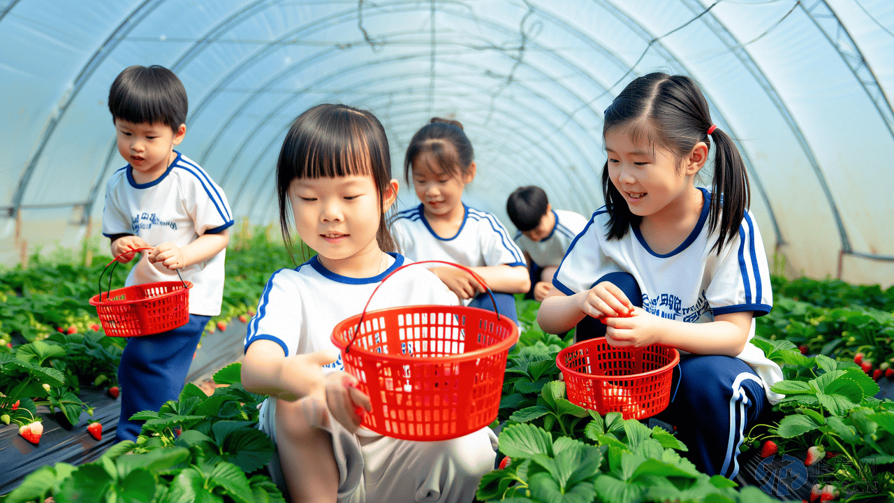 在草莓大棚中,孩子们亲手采摘那些晶莹剔透的草莓,体验收获的喜悦。他们在绿叶中寻找最大的草莓,互相分享采摘的乐趣,整个过程中充满了欢声笑语。