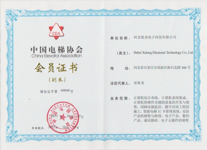 证书介绍 河北旭龙电子科技有限公司成立于2009年,是一家以智能电梯IC卡楼层管理系统的研发、生产、销售、安装为一体的综合性系统集成公司,公司有多年的项目设计和施工经验,在方案设计、技术支持、产品调试安装、售后等多个方面为客户提供全方位的服务,业务面涵盖了房地产、金融、政府、部队、企事业单位、医院等众多领域,为无数客户提供优质的产品与完美的解决方案,满足了不同客户的个性化需求。