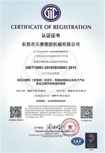 东莞市天赛塑胶机械有限公司ISO9001认证证书