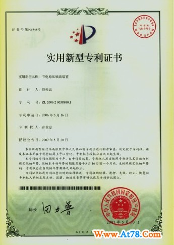证书介绍 一种节电镇流稳压装置。,包括顺序电连接的桥式镇流电路、电解电容滤波电路、半桥逆变电路、LC输出电路,所述节电稳压镇流装置还包括用以抑制高频电流谐波对电网产生污染的电磁兼容滤波器EMC电路用以提高功率因数、降低谐波、实现恒功率输出的有源功率因数校正电路,用以防止异常状态对镇流装置产生损害的异常状态保护电路,所述电磁兼容滤波器EMC电路连接在桥式整流电路与电解电容滤波电路之间,所述异常状态保护电路设置在半桥逆变电路之中。本装置还可以抵御瞬时尖峰脉冲或强雷电干扰,有效抑制浪涌电流,具备多负载输出,延时启动,延长灯具工作寿命的功能 证书图片 |
