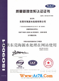 东莞市海源水处理有限公司已通过ISO9001质量管理体系认证