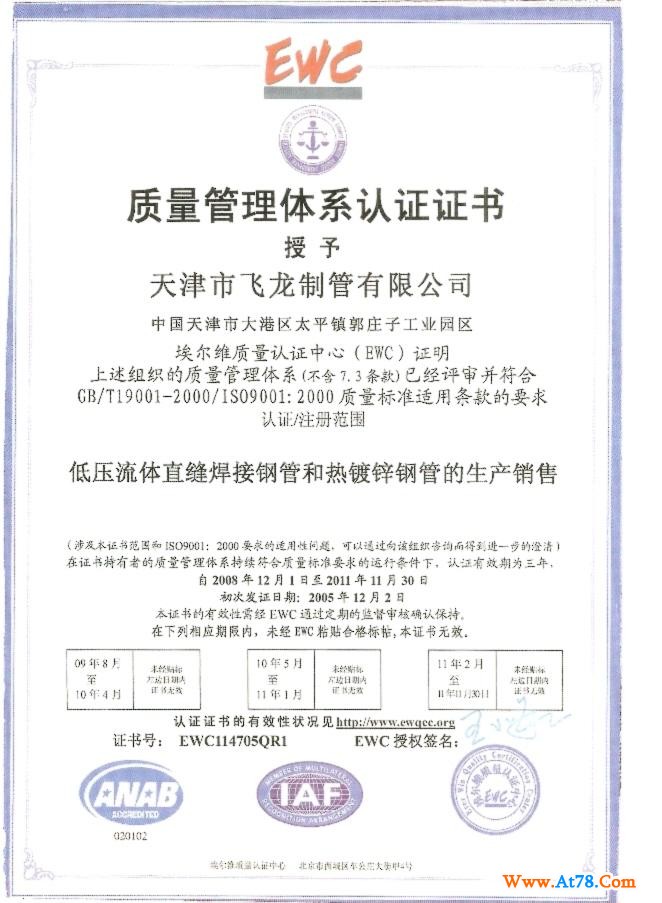 证书介绍 天津飞龙制管股份有限公司真诚的与新老客户合作,与各界友人携手再铸辉煌! 主要产品:4分-10寸、 :108、133、140、159、165、219,管材材质:Q195、215、235 热扩管:245、250、273、299、325、377、426磨管:108、133.、140、159、108、165、219 长期供应~各种行号的 钢管 磨管 焊管 镀锌管 ,符合国标GB/T 9711-1999标准. 可以按照客户要求生产外径为4分6分1寸 1.2寸 165MM, 219MM, 325MM, 377MM 等特殊行号 的直缝焊接钢管。龙生产的热度锌管符合国标GB/T 3091-2001标准. 大量生产 (377×8 -10) (325×5.6.7.8.9.10)(273×5.6.7.8.9.10)(245×5.6.7.8-10)(219×5~10) 各种型号20~377 × 1~9 供应磨管 焊管 扩管 镀锌管 等 证书图片 |