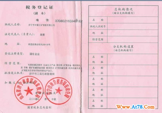 | 发证机构: | 山东济宁市市区国家税务局 | 发证时间 : | 2009-06-01 |